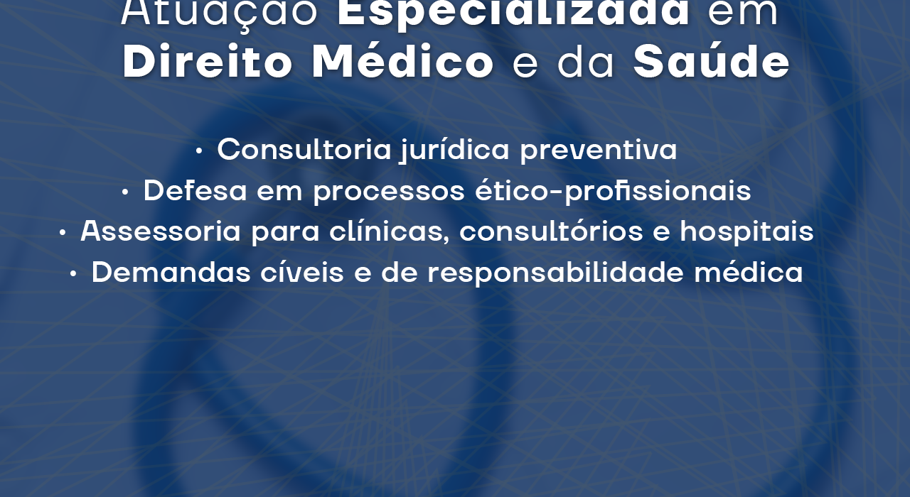 Consultoria jurídica preventiva; Defesa em processos ético-disciplinares e judiciais; Assessoria completa para clínicas, consultórios e hospitais; Gestão de risco e responsabilidade civil médica.